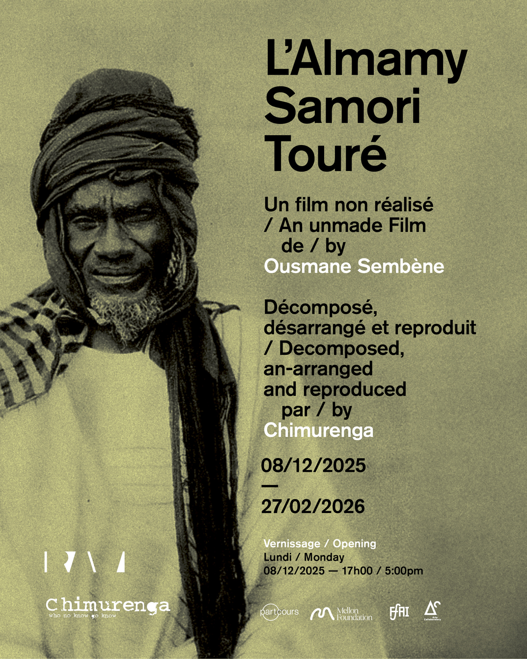 Dans le cadre de la 14ème édition du Partcours, RAW Material Company en collaboration avec Chimurenga* a le plaisir de vous convier au lancement de l’installation bibliographique : L’Almamy Samori Touré – Un film non réalisé de Ousmane Sembène** — décomposé, désarrangé et reproduit par Chimurenga, le lundi 8 décembre 2025, à 17h à RAW Material Company, sis Zone B, villa 2A.